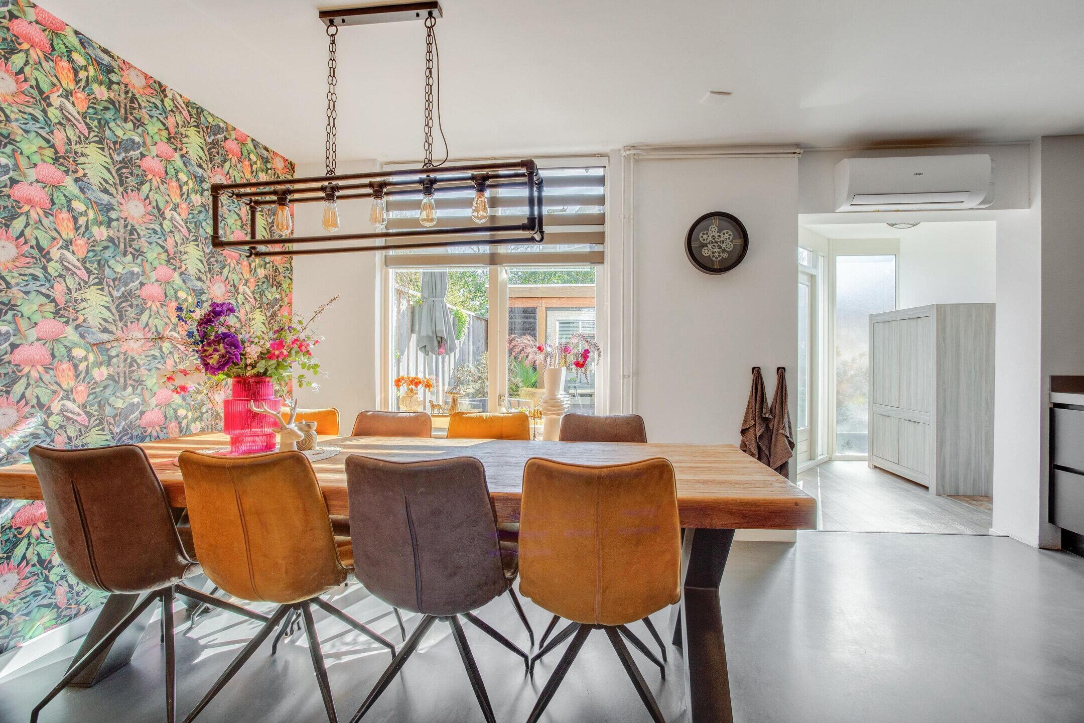 Praktisch voorbeeld. Zet een lange eettafel neer voor familie en vrienden en laat de airconditioning het binnenklimaat aangenaam houden op warme dagen.