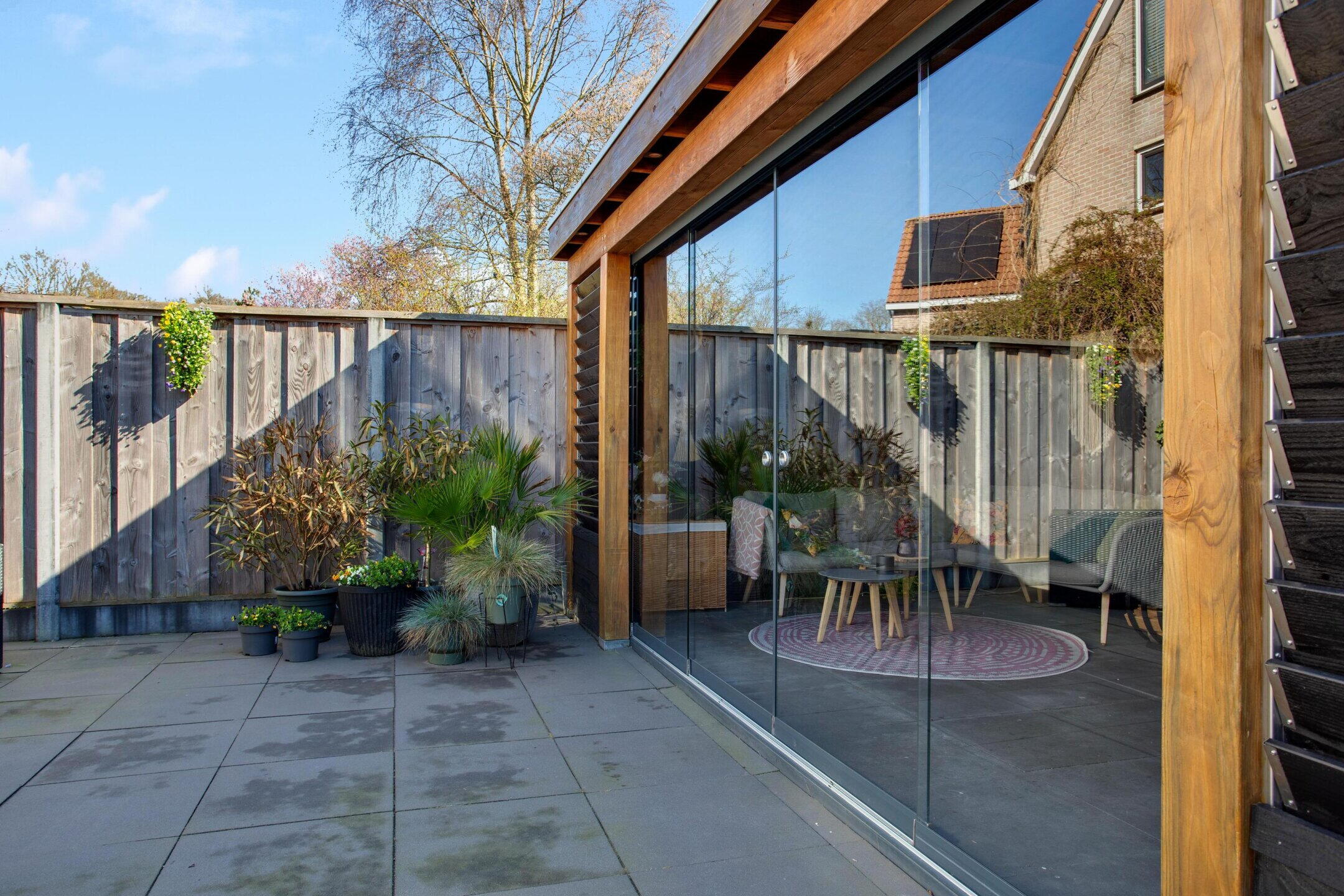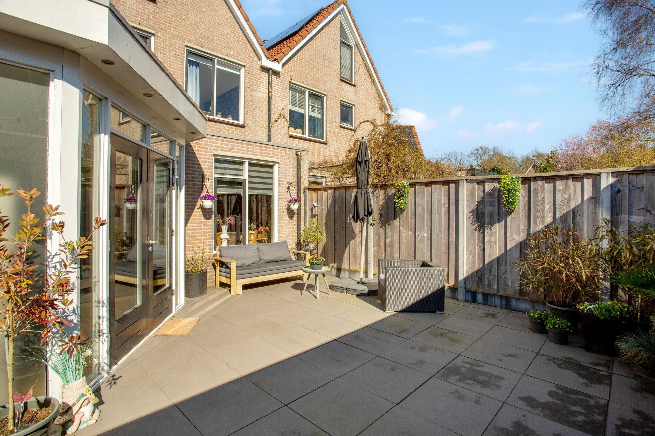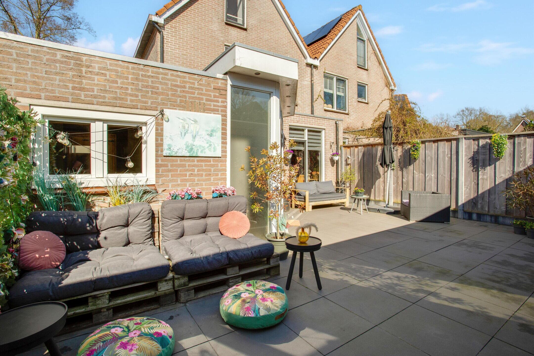De achtertuin ligt op het zuiden en voelt als een extra woonlaag buiten. De overkapping van ongeveer vijf jaar oud verlengt het buitenseizoen. Drink je koffie droog bij een zomerse bui of eet je nog laat buiten wanneer de avond afkoelt, dan kan dat hier eenvoudig.