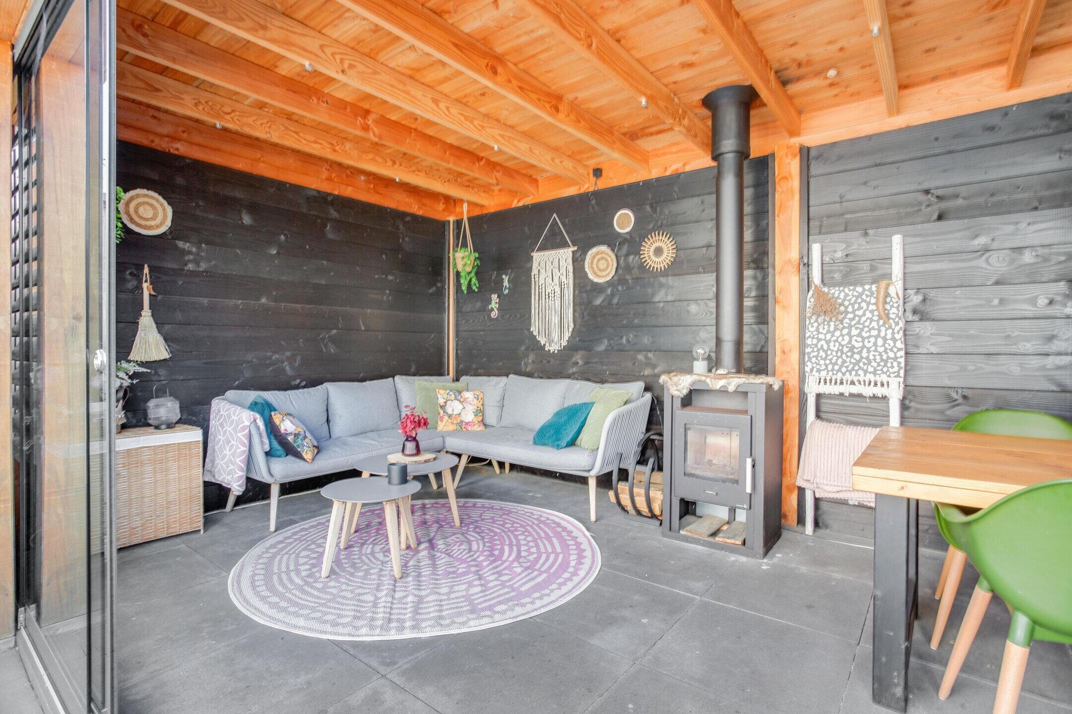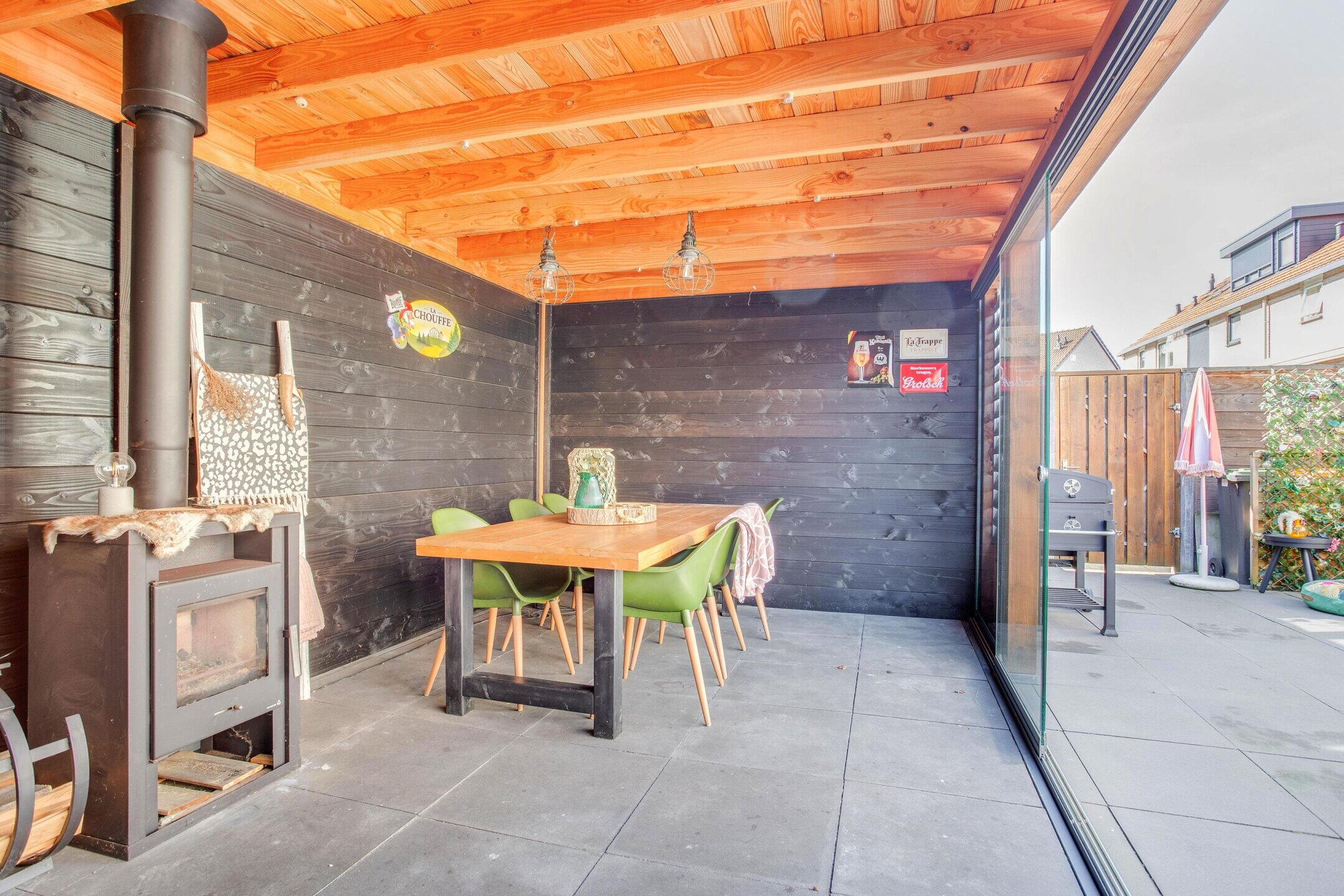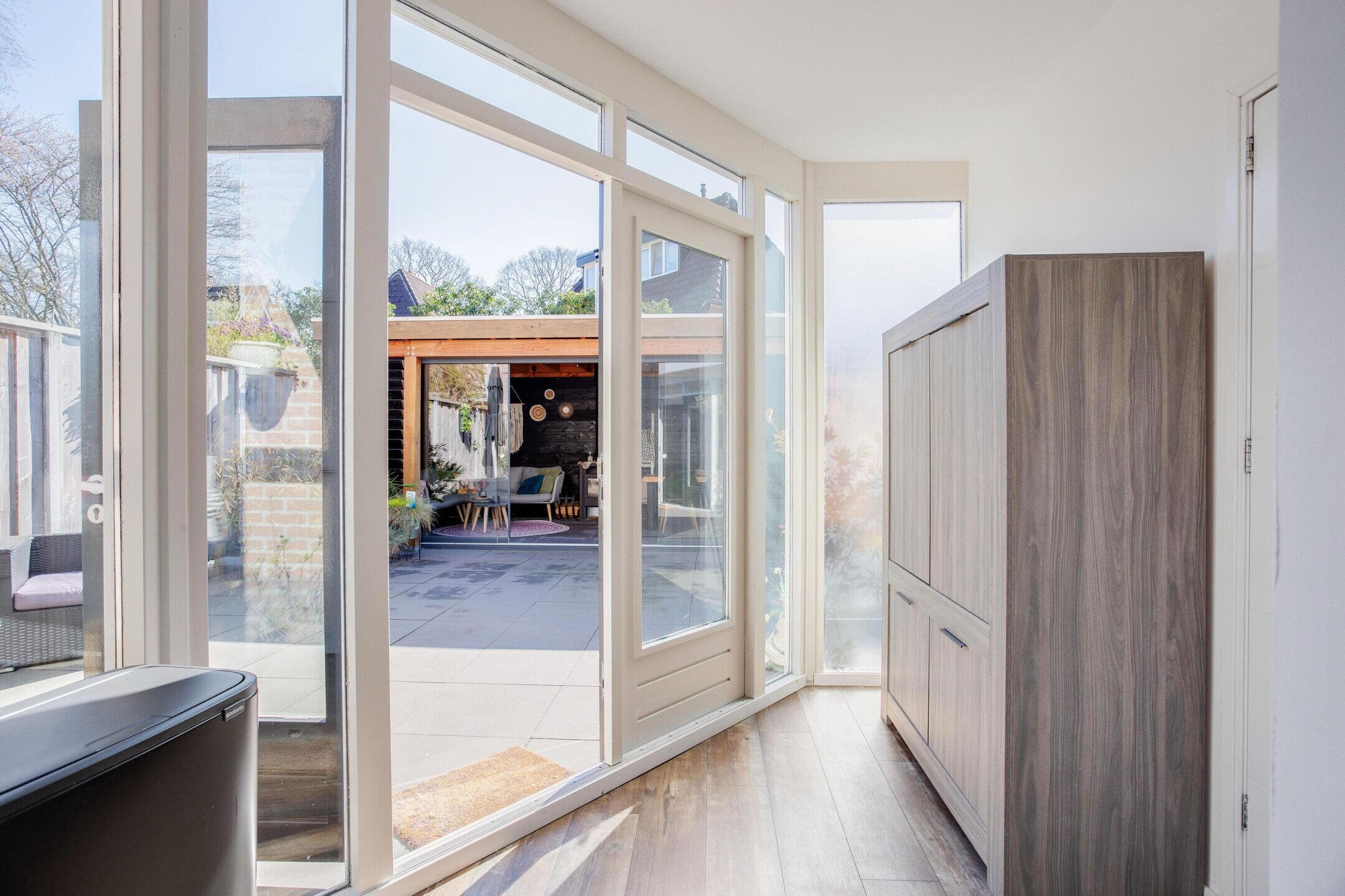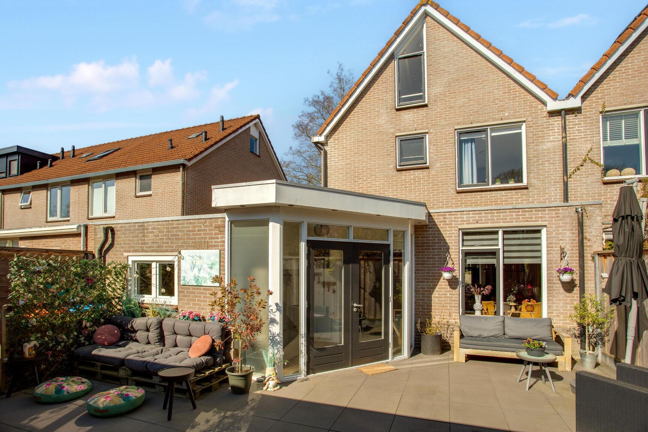 De achtertuin ligt op het zuiden en voelt als een extra woonlaag buiten. De overkapping van ongeveer vijf jaar oud verlengt het buitenseizoen. Drink je koffie droog bij een zomerse bui of eet je nog laat buiten wanneer de avond afkoelt, dan kan dat hier eenvoudig.