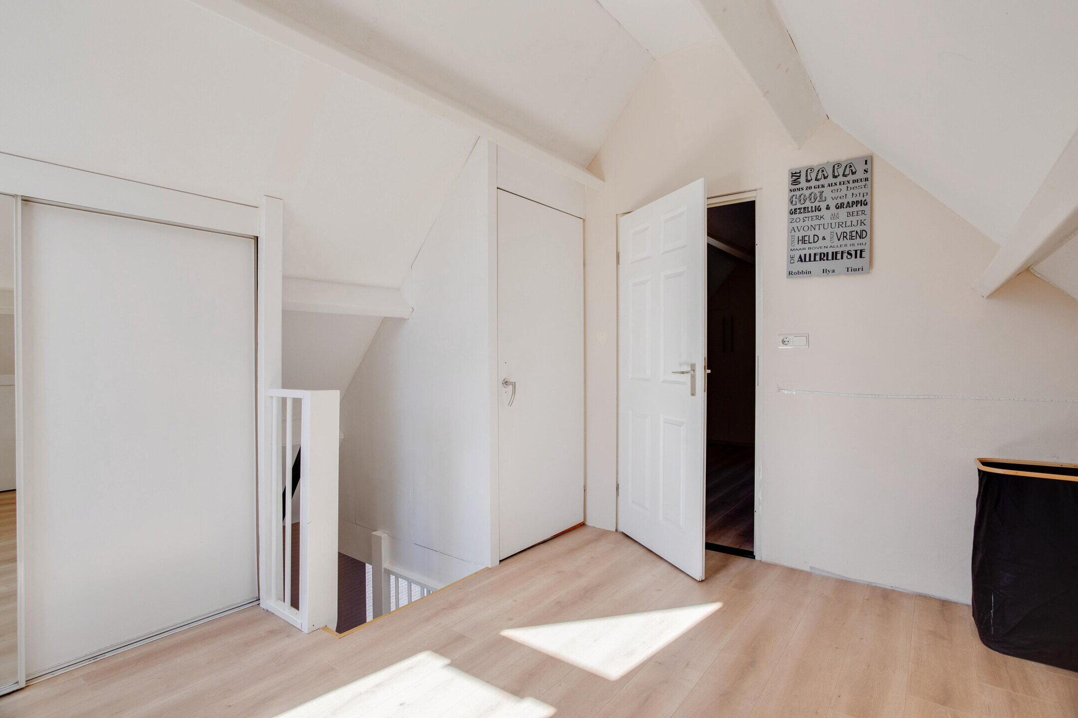 Op de eerste verdieping liggen drie slaapkamers met goede afmetingen. De badkamer is netjes en biedt ruimte om te moderniseren of uit te breiden als je dat wilt. Op de tweede verdieping vind je de vijfde slaapkamer, ideaal als werkplek, speelkamer of logeerkamer.
